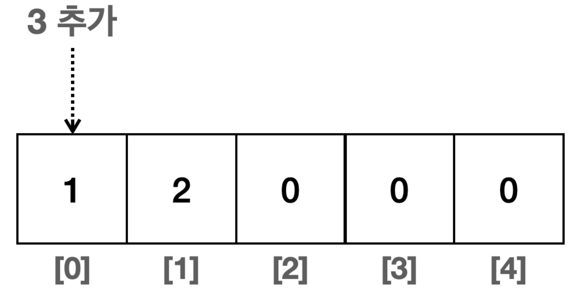 위처럼 1과 2가 순서대로 입력되어 있는 배열 첫번째 위치에 3을 추가하는 상황을 가정해보자. 3을 추가하려면 공간을 확보하기 위해 기존 배열에 있는 값들을 다 한 칸씩 오른쪽으로 밀어야 한다.