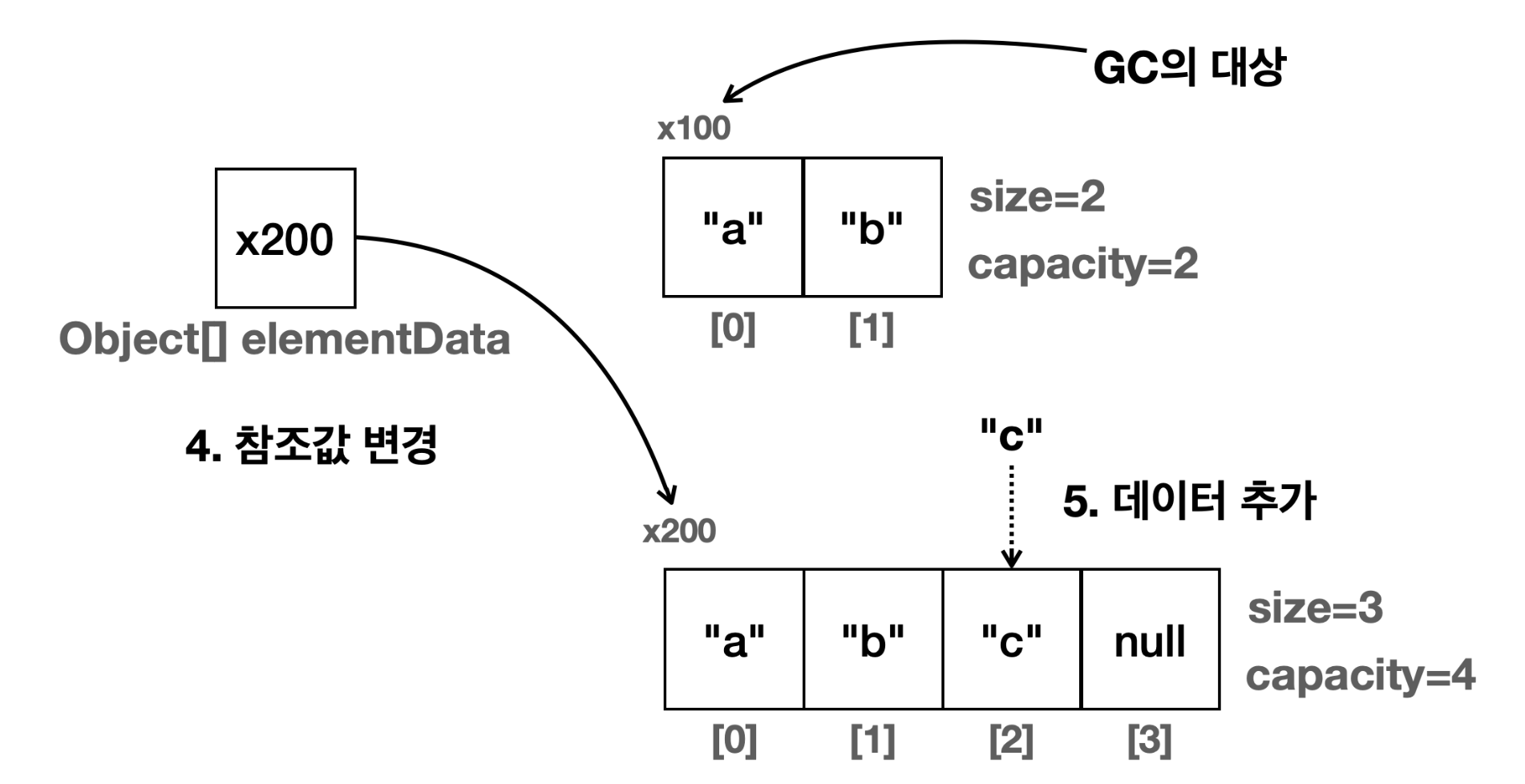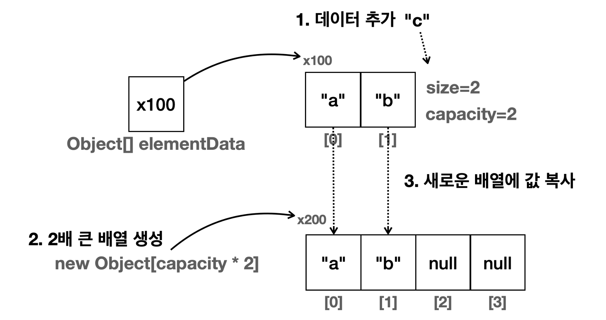 지금까지의 과정을 정리해보자. 배열 리스트(ArrayList)는 리스트(List) 자료 구조를 사용하는데, 내부의 데이터는 배열(Array)에 보관하는 것이다.