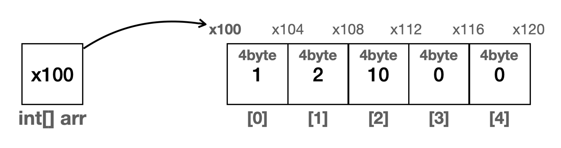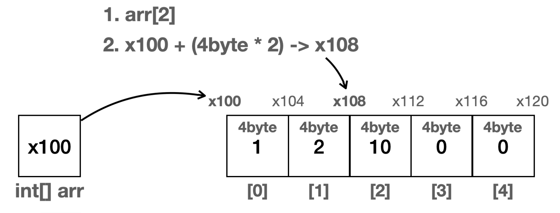 보다시피 어차피 참조값(x100)이 있고, 배열은 메모리상에 순서대로 붙어서 존재하며, 각 공간은 같은 데이터 타입을 사용하기 때문에 그 데이터의 크기만큼 증가한다. 따라서 지금 위의 그림에서는 배열의 시작 위치(x100)부터 시작해서 자료의 크기(4byte)와 인덱스 번호를 곱하면 원하는 메모리 위치를 바로 찾을 수 있는 것이다.