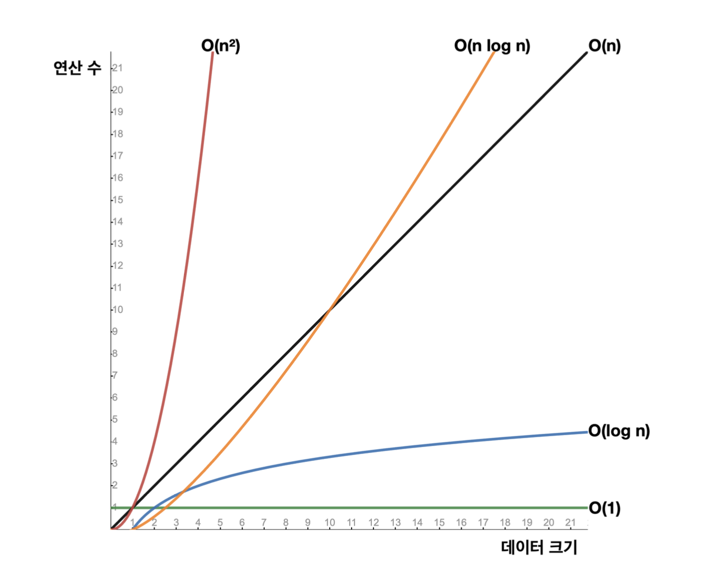 O(1) - 상수 시간: 입력 데이터의 크기에 관계없이 알고리즘의 실행 시간이 일정한다.O(n) - 선형 시간: 알고리즘의 실행 시간이 입력 데이터의 크기에 비례하여 증가한다.O(n²) - 제곱 시간: 알고리즘의 실행 시간이 입력 데이터의 크기의 제곱에 비례하여 증가한다. n²은 n * n 을 뜻한다.O(log n) - 로그 시간: 알고리즘의 실행 시간이 데이터 크기의 로그에 비례하여 증가한다.O(n log n) - 선형 로그 시간: