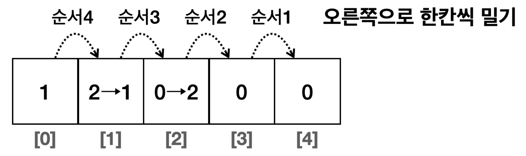 배열의 마지막 부분부터 오른쪽으로 밀어야 데이터를 유지할 수 있다. 왼쪽에 있는 데이터를 오른쪽에 대입하는 과정을 반복한다.