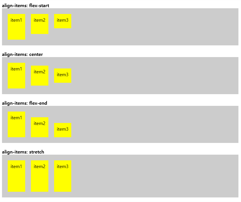 align-items: flex item들의 교차 축 상 위치/여백을 결정한다. 설정값은 바라보는 축만 다를 뿐, justify-content와 동일하다. stretch만 flex item의 높이를 교차 축의 길이와 동일하게 세팅한다는 것만 알아두자.