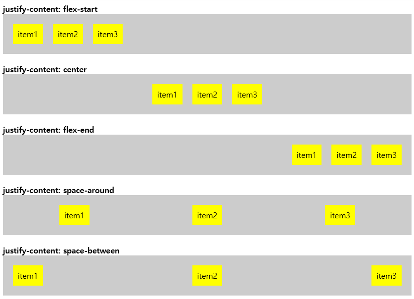 justify-content: flex item들의 주축 상 위치/여백을 결정한다.flex-start: 주축의 시작 지점부터 flex item이 시작된다.center: flex item이 주축 중앙으로 정렬된다.flex-end: flex item이 주축 끝 지점부터 정렬된다.space-around: flex item이 동일한 여백으로 정렬된다. 이때 flex container의 시작과 끝 지점에는 flex item 사이 여백의 1/2에 해당하는 여백이 들어간다.space-between: flex item이 동일한 여백으로 정렬된다. 하지만 space-around와는 다르게 flex container의 시작과 끝에는 여백이 존재하지 않는다.