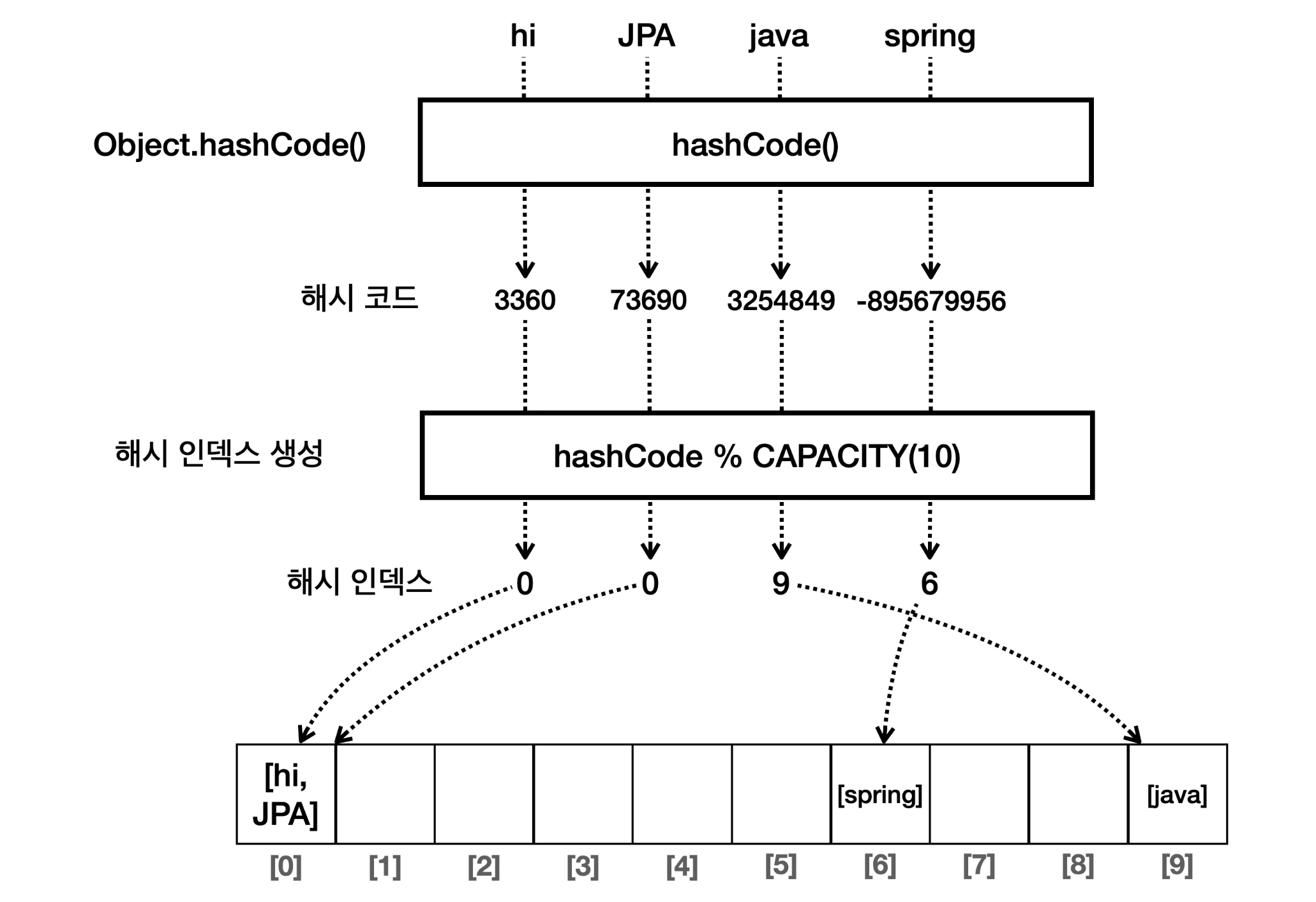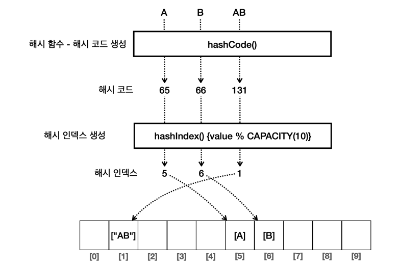 “Aa”.hashCode()의 해시 코드: 2112“BB”.hashCode()의 해시 코드: 2112위와 같이 해시 인덱스가 같을 수도 있다. 하지만 equals() 메서드를 사용해서 다시 비교하기 때문에 해시 코드가 충돌되더라도 문제가 되지는 않는다. 그리고 매우 낮은 확률로 충돌하기 때문에 성능에 대한 부분도 크게 걱정하지 않아도 된다.