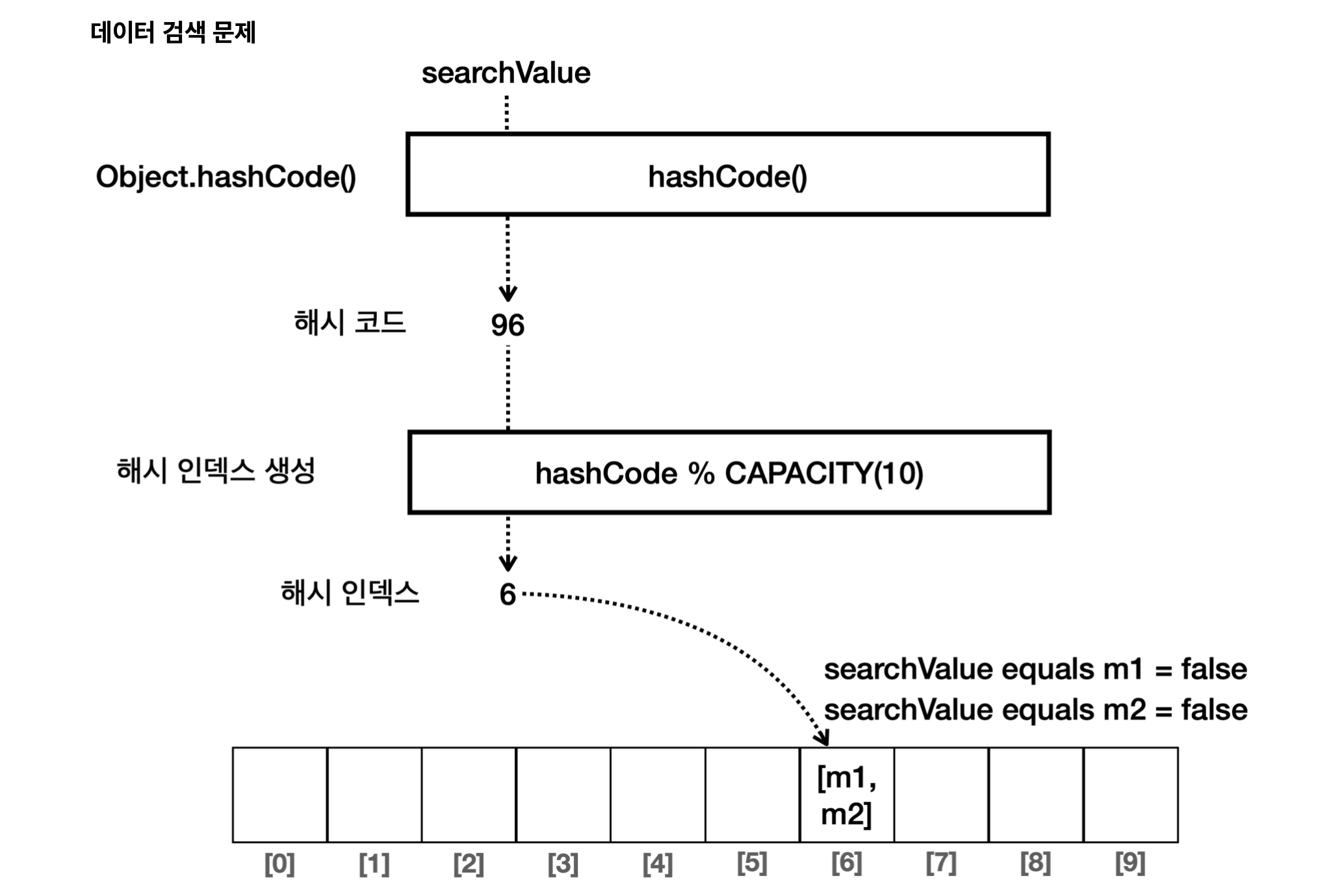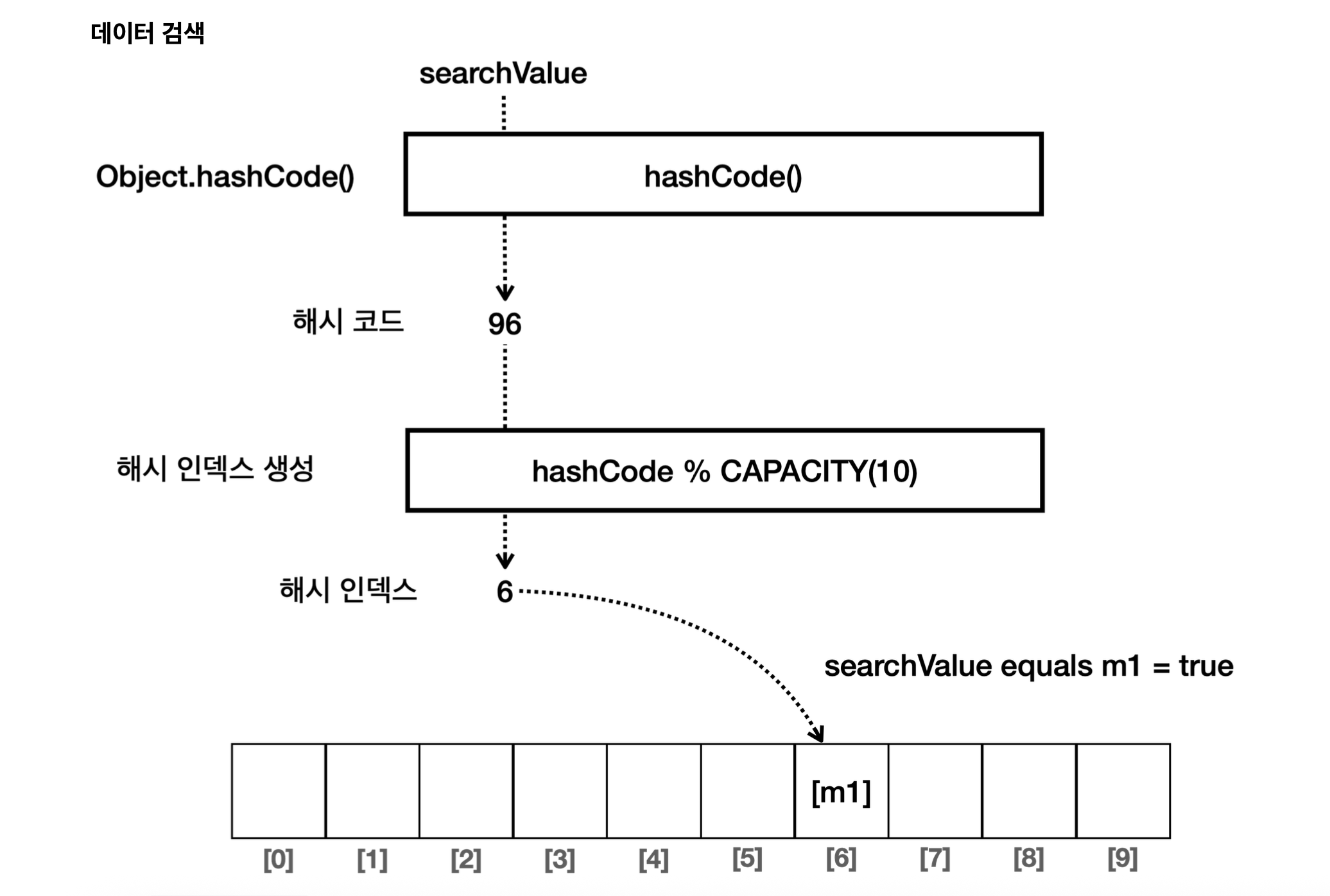 데이터를 검색할 때도 마찬가지다. searchValue의 해시 코드로 6번 인덱스를 찾아가서, 내부의 모든 데이터를 equals() 메서드로 비교한다. m1의 값과 같기 때문에 데이터를 성공적으로 찾을 수 있다.