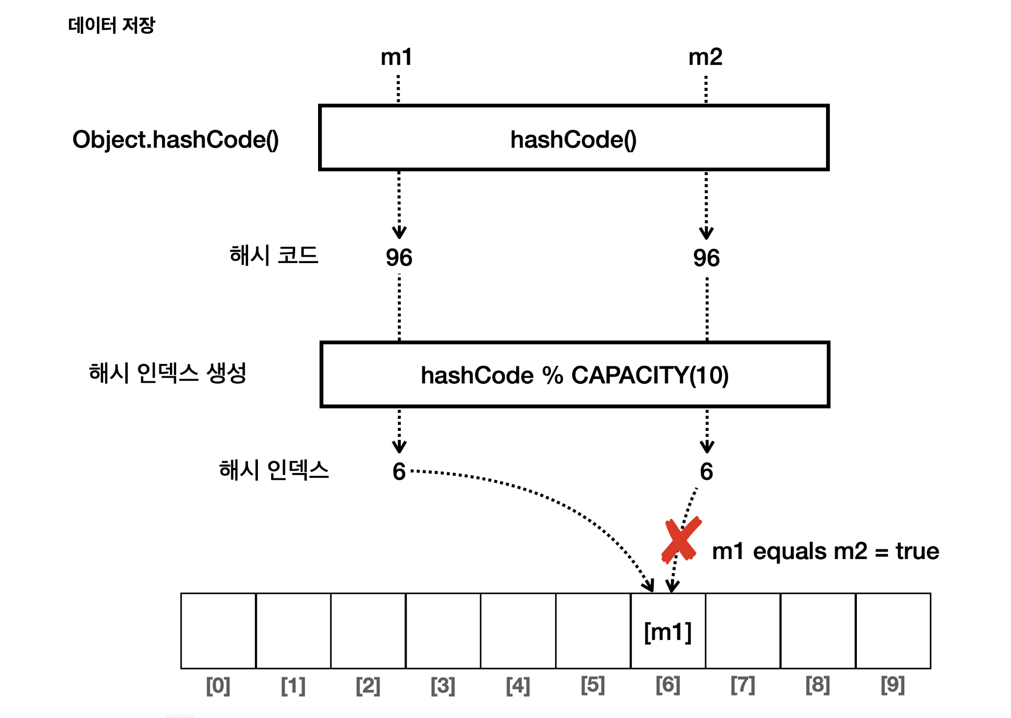 일단 처음에 m1을 저장하고 그 다음으로 m2의 저장을 시도했을 때, m1과 m2는 모두 같은 해시 코드를 사용하므로 일단 6번 인덱스로 찾아간다. 근데 equals() 메서드를 통해 같은 데이터가 있는 것을 알아차리고 m2는 튕겨낸다. 이런 식으로 중복 데이터가 저장되지 않도록 한다.