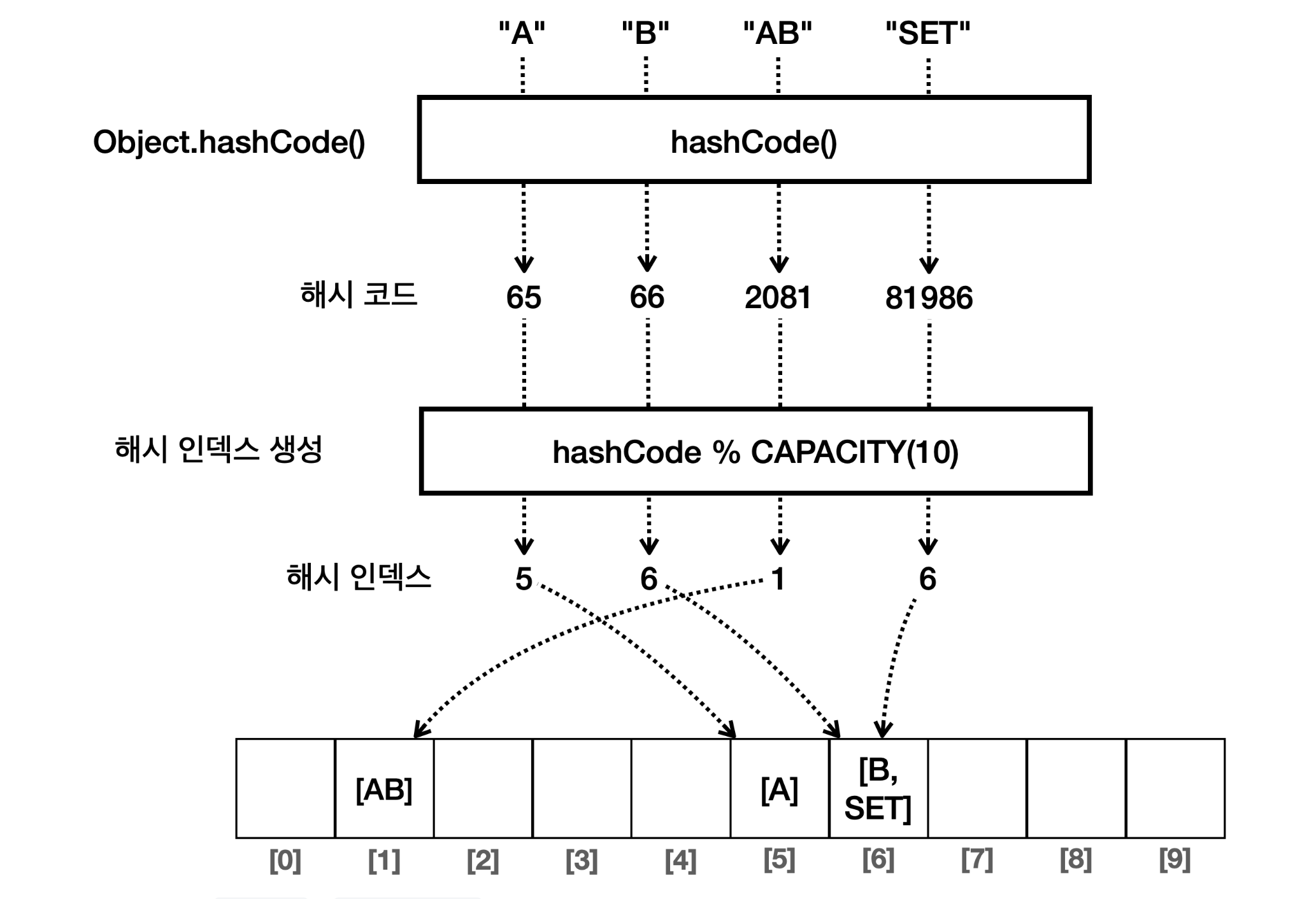 System.out.println(set); // 해시 인덱스가 같으니까 일단 같은 위치에 들어감.