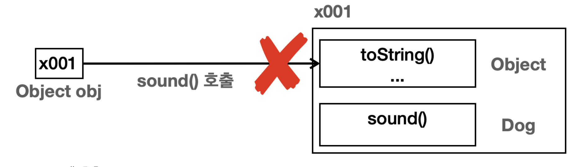 // object.sound(); // Object는 자식 클래스에 대한 정보가 없음