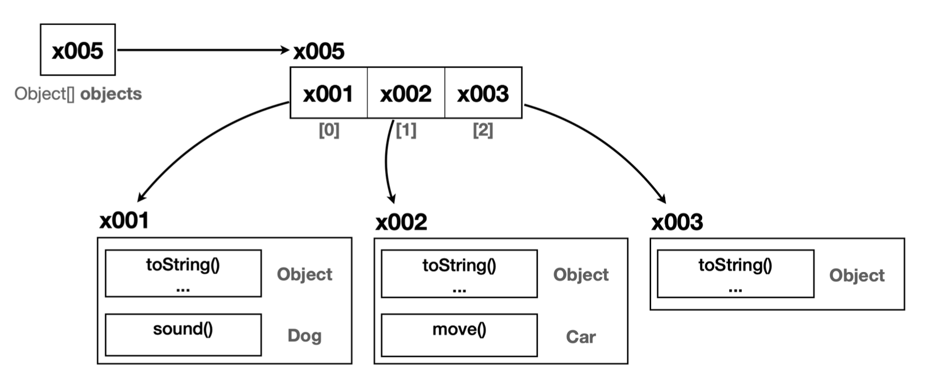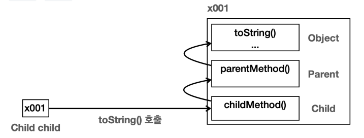 알다시피, Parent는 Object 클래스를 묵시적으로 상속 받았기 때문에 당연히 메모리 상에도 Object 인스턴스가 생성되었을 것이다. 여기서 child.toString() 호출하면, Child와 Parent에 없으므로 마지막인 Object 클래스에서 찾아 호출한다. 하여간 중요한 점은 자바에서 모든 객체의 최종 부모는 Object라는 것이다.