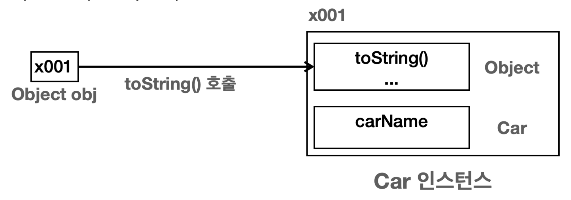 ObjectPrinter에 Car 인스턴스를 넘기면, 메서드 내부에서 obj.toString()를 호출한다. 보다시피 obj는 Object 타입이다. 따라서 Object 내부의 toString() 메서드를 찾을 것이고 자식에 오버라이딩을 했는지 찾아본다. Car 클래스에서는 메서드 오버라이딩을 하지 않았으므로 Object.toString()을 실행한다.