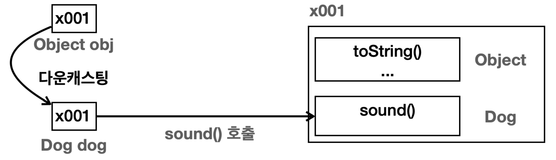 그렇기 때문에 Dog나 Car 등 Object를 통해 전달 받은 객체를 호출하려면 각 객체에 맞는 다운 캐스팅 과정이 필요한 것이다.