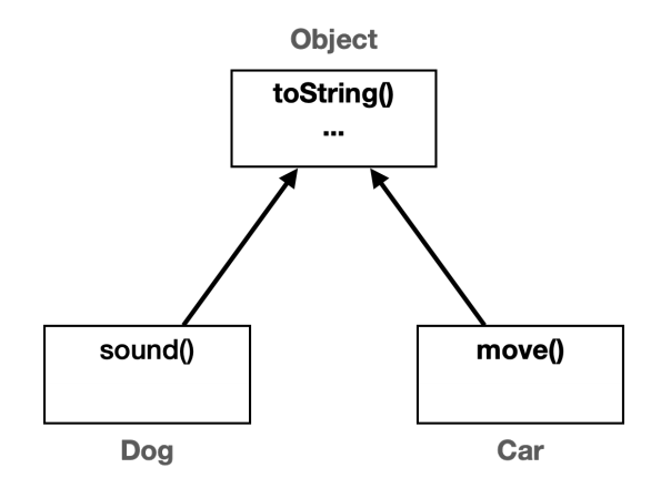 Dog, Car 클래스는 서로 아무런 관련이 없고, 둘 다 부모 클래스도 없다. 따라서 Object 클래스를 묵시적으로 상속 받을 것이다.