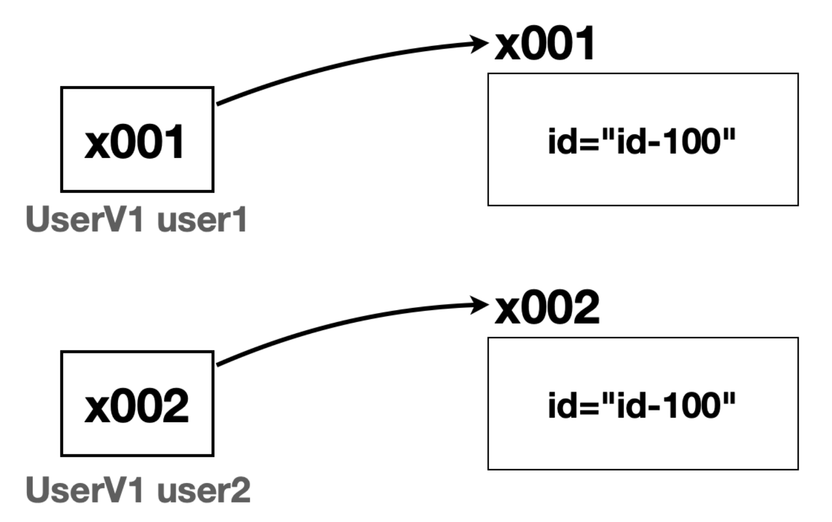 위의 코드를 그림으로 표현하면 아래와 같을 것이다. 당연히 참조가 다른 인스턴스가 생성되고, 그 안에 값은 id-100으로 동일할 것이다.