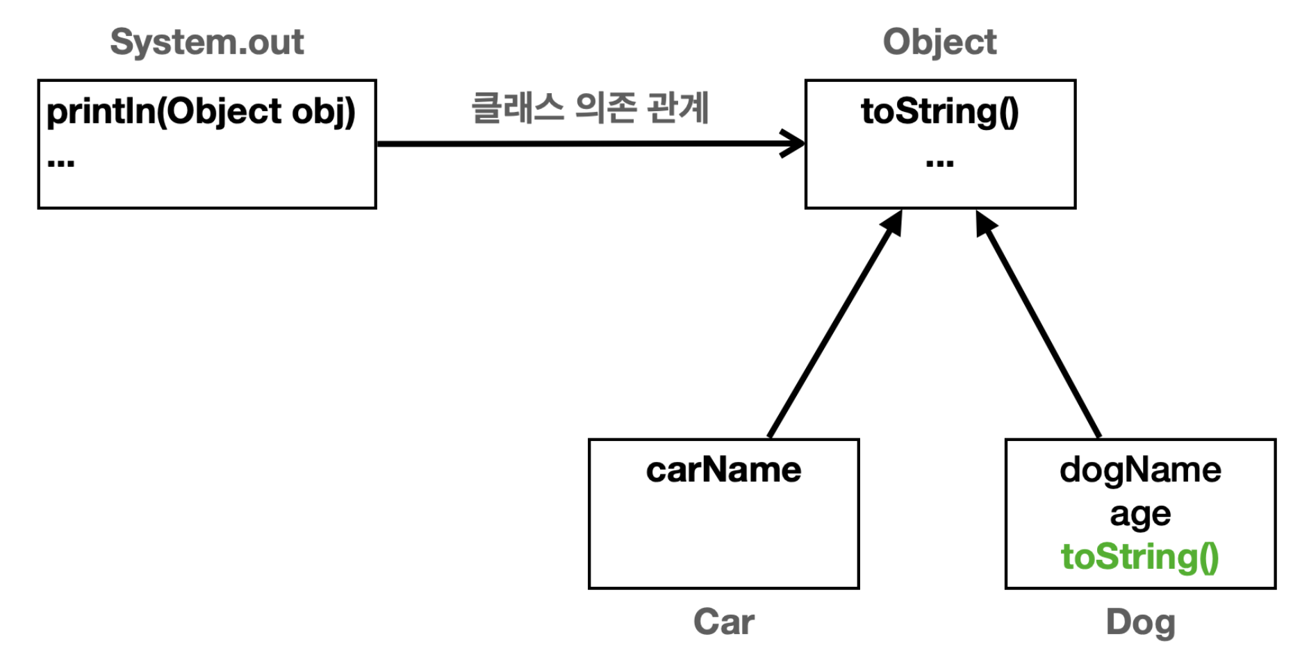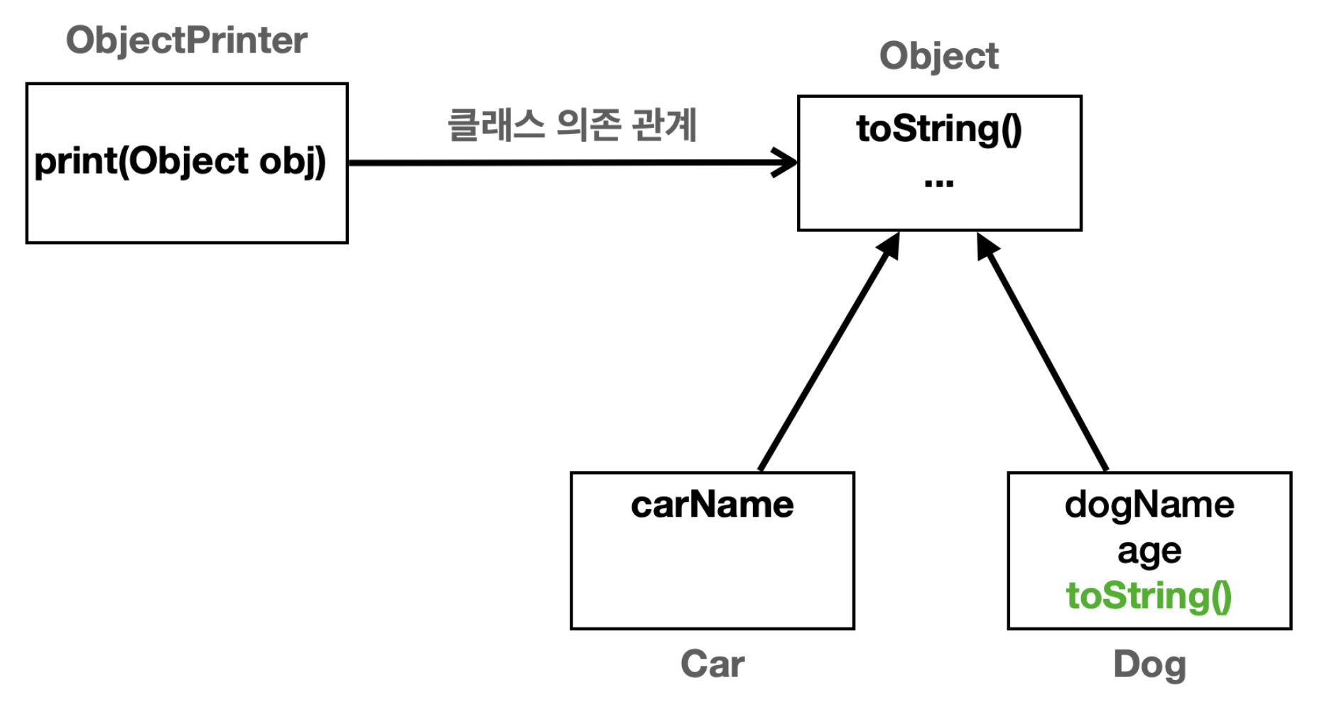 현재 BadObjectPrinter는 구체적인 타입인 Car , Dog를 사용한다. 따라서 이후에 출력해야 할 구체적인 클래스가 10개로 늘어난다면 구체적인 클래스에 맞춰 메서드도 10개로 계속 늘어나게 된다. 이렇게 BadObjectPrinter 클래스가 구체적인 특정 클래스인 Car , Dog를 사용하는 것을 BadObjectPrinter는 Car , Dog에 의존한다고 표현한다. 다행히도 자바에는 객체의 정보를 사용할 때, 다형적 참조 문제를 해결해줄 Object 클래스와 메서드 오버라이딩 문제를 해결해줄 Object.toString() 메서드가 있다.