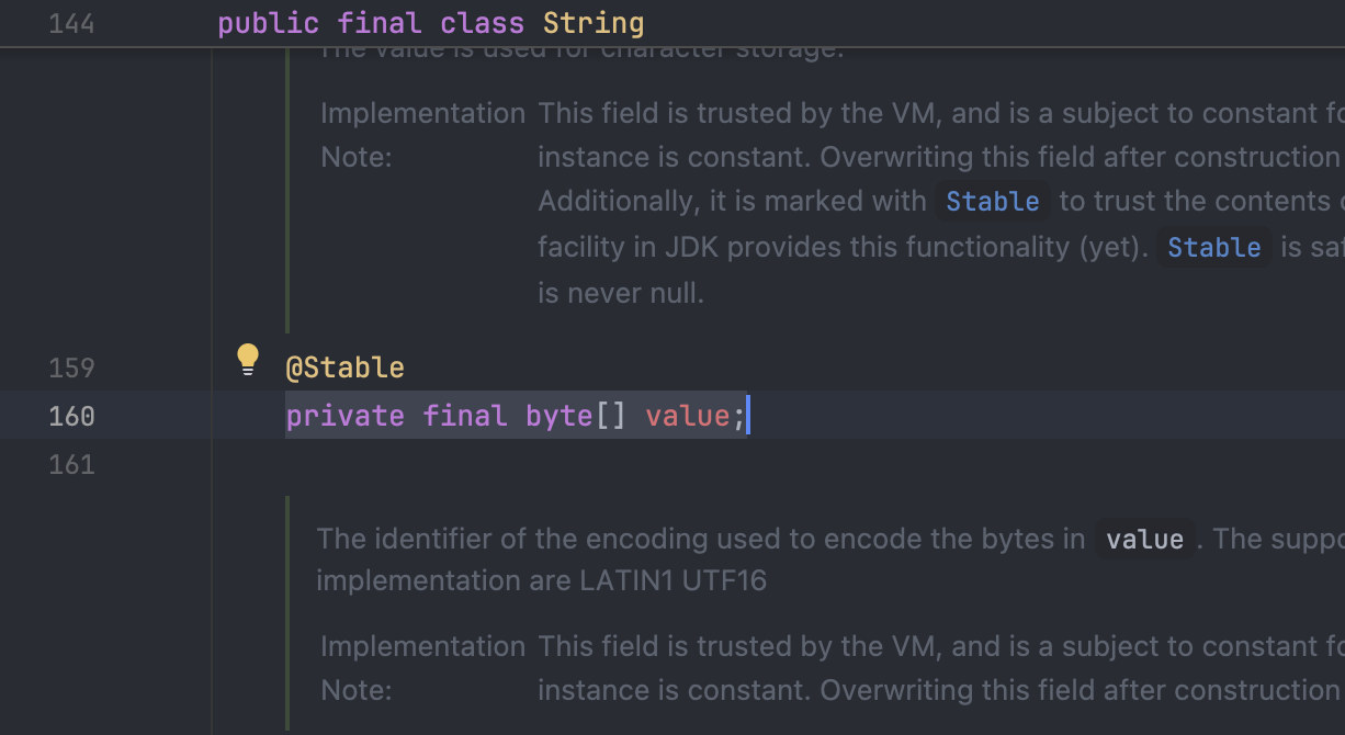 원래 char[] 캐릭터 배열로 보관했다. 실제로 문자 하나하나를 가지고 있고, 기본형인 char를 배열로 모아 문자열이 되는 것이다. 기본형은 약간 생명이 없는 데이터 조각같은 느낌이다. 반면, String 클래스는 기본형 데이터 조각을 속성으로 가지면서 여러 기능을 부여해 마치 살아있는 것처럼 객체 지향적으로 사용할 수 있다. 그리고 자바 9 이후로는 위와 같이 char[] 대신, byte[]를 사용한다. char는 2byte를 차지한다. 근데 영어, 숫자는 보통 1byte로 표현이 가능한데, 단순 영어나 숫자로만 표현된 경우에 1byte를 사용하고, 그렇지 않은 경우는 2byte인 UTF-16 인코딩을 사용한다. 따라서 메모리를 더 효율적으로 사용할 수 있게 변경된 것이다.
