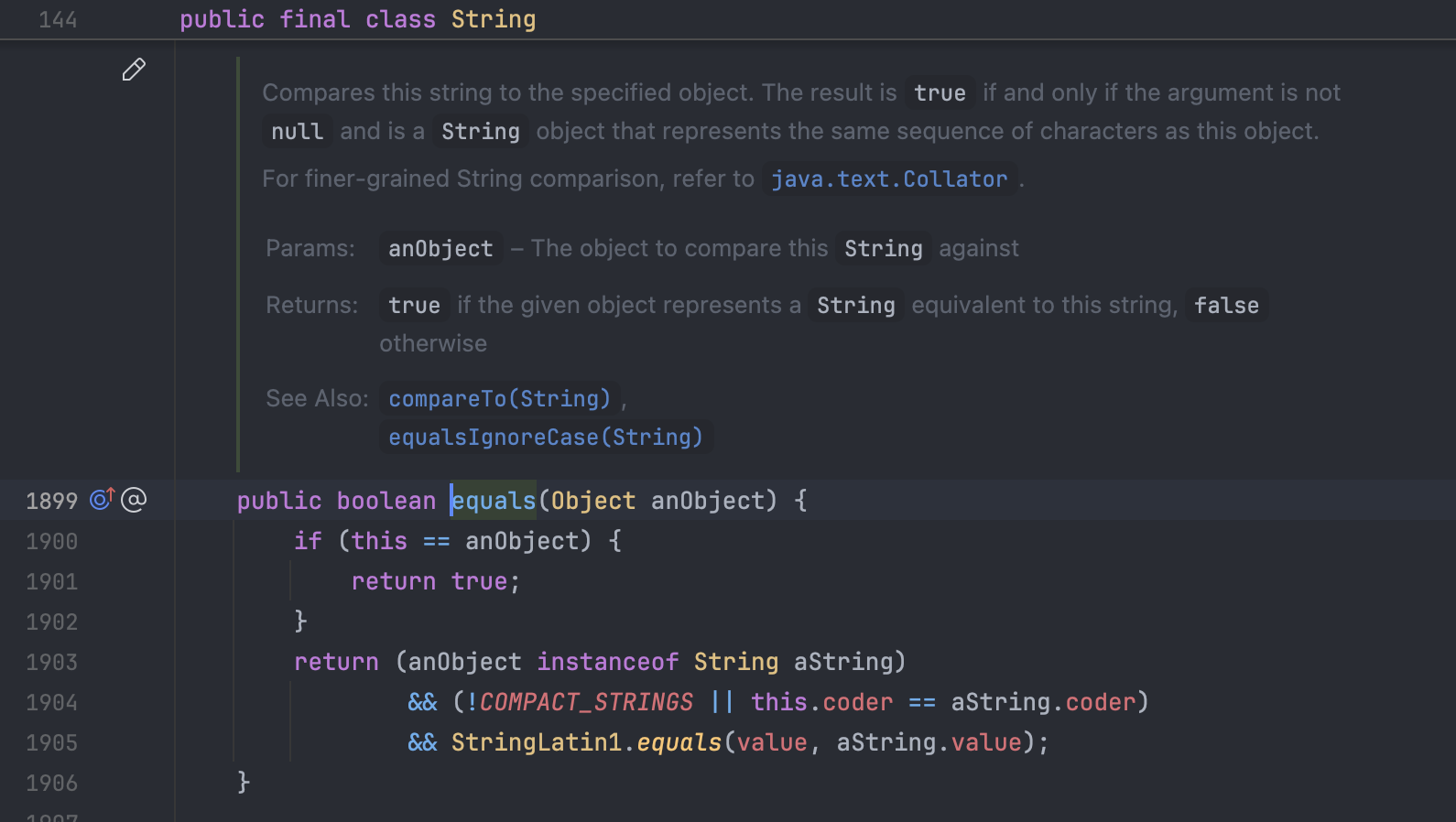 위와 같이 String 에 있는 equals() 메서드는 오버라이딩 되어 있는 것을 확인할 수 있다.