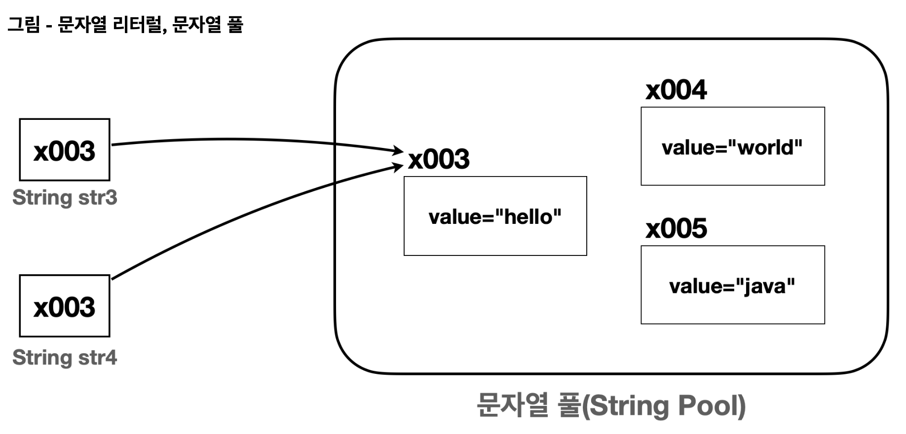 String str3 = "hello"와 같이 문자열 리터럴을 사용하면 문자열 풀에서 “hello” 라는 문자를 가진 String 인스턴스를 찾는다. 그리고 찾은 인스턴스의 참조값을 반환한다. String str4 = "hello" 의 경우에는, 동일한 "hello" 문자열 리터럴을 사용하므로 문자열 풀에서 str3과 같은 참조값을 통해 접근한다. 이처럼 문자열 풀 덕분에 문자를 사용하는 경우, 메모리 사용을 줄이고 문자를 만드는 시간도 줄어들기 때문에 성능 최적화를 꾀할 수 있다.