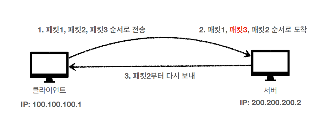 ํด๋ผ์ด์ธํธ๊ฐ ํจํท์ 1๋ฒ, 2๋ฒ, 3๋ฒ ์์๋ก ๋ณด๋๋ค๊ณ ๊ฐ์ ํ์. ํ์ง๋ง ์๋ฒ๋ ๋คํธ์ํฌ ์ํฉ์ ๋ฐ๋ผ 1๋ฒ, 3๋ฒ, 2๋ฒ ์์๋ก ๋ฐ์ ์๋ ์๋ค.