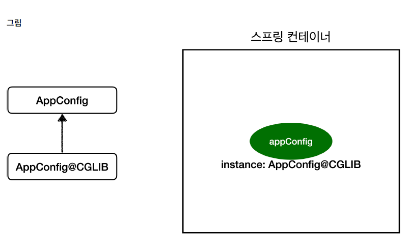 AppConfig가 AppConfig@CGLIB가 AppConfig를 상속받아서 다른 클래스를 하나 만들었다는 거다. 그리고 스프링이 조작한 AppConfig@CGLIB 클래스를 스프링 빈으로 등록해버리는 거다. 그래서 스프링 컨테이너에는 분명히 이름은 AppConfig인데, 인스턴스 객체가 AppConfig@CGLIB인 녀석이 들어가 있는 것이다.