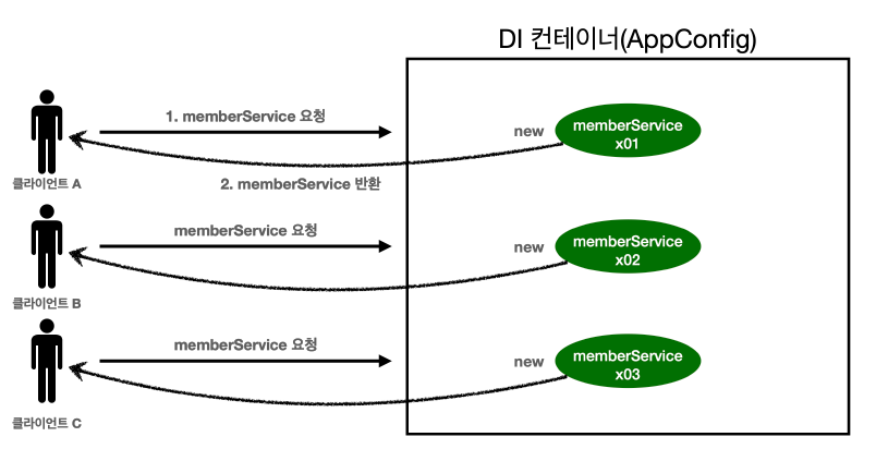 클라이언트 A, B, C가 memberService를 스프링에게 요청한다. 그럼 DI 컨테이너(AppConfig)에서 MemberServiceImpl을 객체로 생성해서 거기에 memberRepository를 주입하고 클라이언트한테 반환한다.