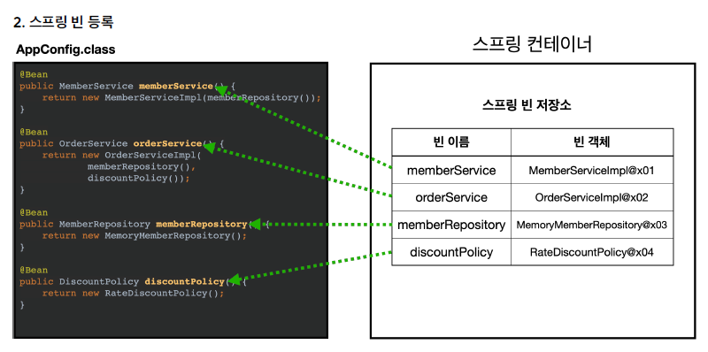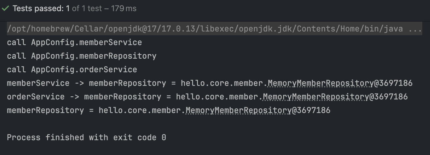 AppConfig를 보면 이상한 점이 있다. 만약 스프링이 memberService를 호출하면, MemoryMemberRepository()를 주입받은 MemberServiceImpl이 생성되는 것이다. orderService 빈도 똑같이 OrderServiceImpl을 생성하는데 여기 memberRepository가 또 호출되어 MemoryMemberRepository 인스턴스가 또 생성될 것이다.