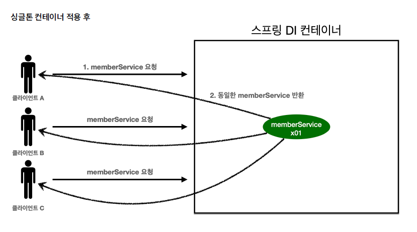 클라이언트 A, B, C가 올 때마다 동일한 memberService를 반환해준다. 스프링 컨테이너 덕분에 고객의 요청이 올 때마다 객체를 생성하는 것이 아니라, 이미 만들어진 객체를 공유해서 효율적으로 사용할 수 있는 것이다. 근데 이렇게 객체 하나를 여러 명이 사용하면 그 객체는 더러워지는거 아닌가…?