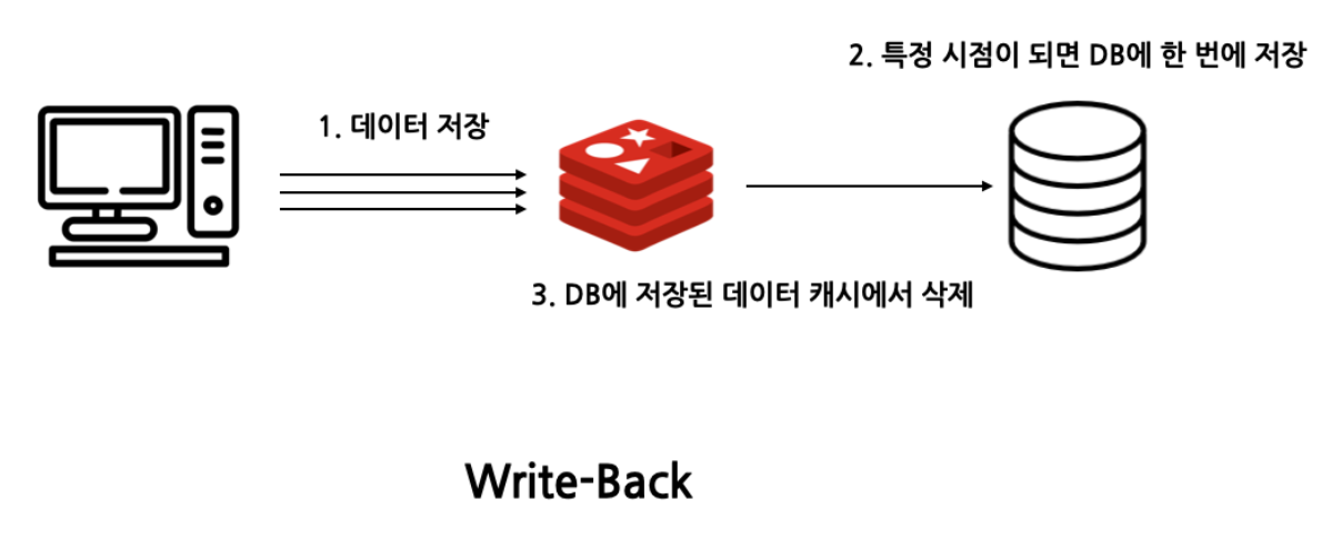 이 방식에서는 캐시에 데이터를 미리 한꺼번에 써 놓고, 나중에 DB에 기록한다. 다만, 기록할 때 DB에 바로 쿼리하지 않고, 캐시에 모아서 일정 시간이 지난 뒤에 한꺼번에 많은 양의 데이터를 한 번의 쓰기 요청으로 해결한다. 그렇게 DB에 저장된 데이터는 캐시에서 삭제한다. 이처럼 모아 놓았다가 한 번의 INSERT 문으로 처리하기 때문에 쓰기 쿼리 비용을 줄이고, 성능적으로 이점을 가져갈 수 있다.