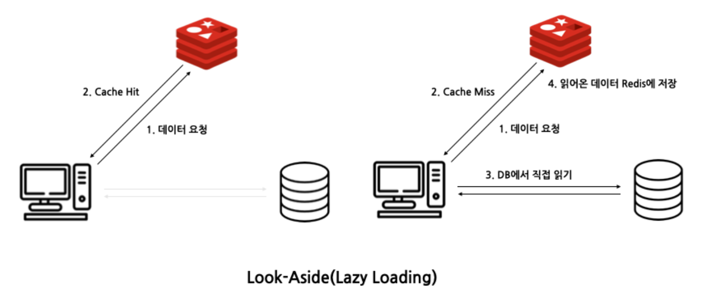 Look-Aside : 애플리케이션이 DB 조회와 캐시 갱신을 직접 관리해야 한다.Read-Through : 캐시에서 DB에 데이터를 직접 조회하여 로드한다. 그리고 캐시는 반드시 DB의 데이터 모델과 동일한 구조를 유지해야 한다.Read-Through Cache 방식에서는 동일한 데이터가 반복적으로 요청되는 읽기 중심 워크로드에서 가장 효과적이다. 그리고, 캐시와 DB 간의 동기화가 항상 이루어져 있기 때문에 항상 데이터의 정합성이 보장된다. 다만, 데이터가 처음 요청될 때는 항상 캐시 미스가 발생하며, 캐시를 채우는 추가적인 시간이 소요된다. 또한, 캐시가 죽어버리면, 애플리케이션에도 문제가 발생한다.