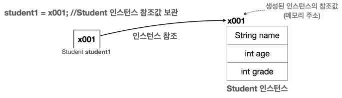 객체를 생성하기만 하면 뭐하나, 어디에 만들었는지 알아야 접근해서 사용할 수 있을 것이다. 그래서 new 키워드를 통해 객체가 생성되고 메모리 어딘가에 있는 해당 객체에 접근할 수 있는 참조값이 반환하는데, 앞서 선언한 변수 student1에 생성된 인스턴스의 참조값(x001)을 보관하는 것이다. 따라서 이제 student1 변수를 통해서 메모리에 있는 실제 객체에 접근(참조)할 수 있는 것이다.
