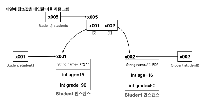 student1에는 참조값 x001이, student2에는 참조값 x002가 들어있었다. 그 값을 복사해서 students 배열의 각각의 인덱스에 전달하는 것이다. 이제 배열은 x001, x002의 참조값을 가지고 있기 때문에 학생1과 학생2 인스턴스에 모두 접근할 수 있다.