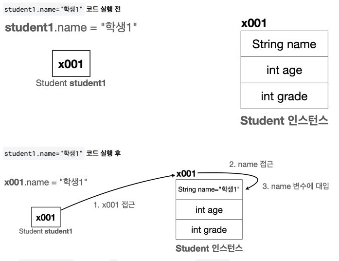 객체가 가지고 있는 멤버 변수(name, age, grade)에 값을 대입하기 위해서 일단 온점(.)을 사용해 student1에 들어있는 참조값(x001)을 읽어서 메모리에 존재하는 객체에 접근한다.