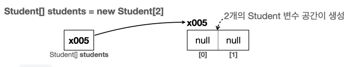“학생들” 을 보관할 수 있는 사이즈가 2인 배열 students인 것이다. Student 타입의 변수는 Student 인스턴스의 참조값을 담을 수 있었다. 이와 같이, Student 배열의 각각의 항목도 Student 타입의 변수일 뿐이고, 그 변수들도 참조값을 보관하는 것이 역할일 것이다. 하지만, Student[] students = new Student[2] 이 부분만으로는 아직 배열에 참조값을 대입하지는 않았기 때문에 각각 null 값으로 초기화된다.