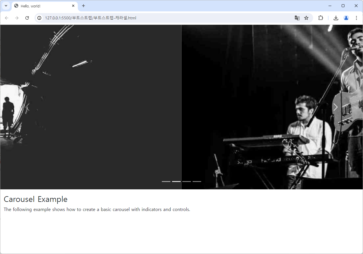 <p>The following example shows how to create a basic carousel with indicators and controls.</p>