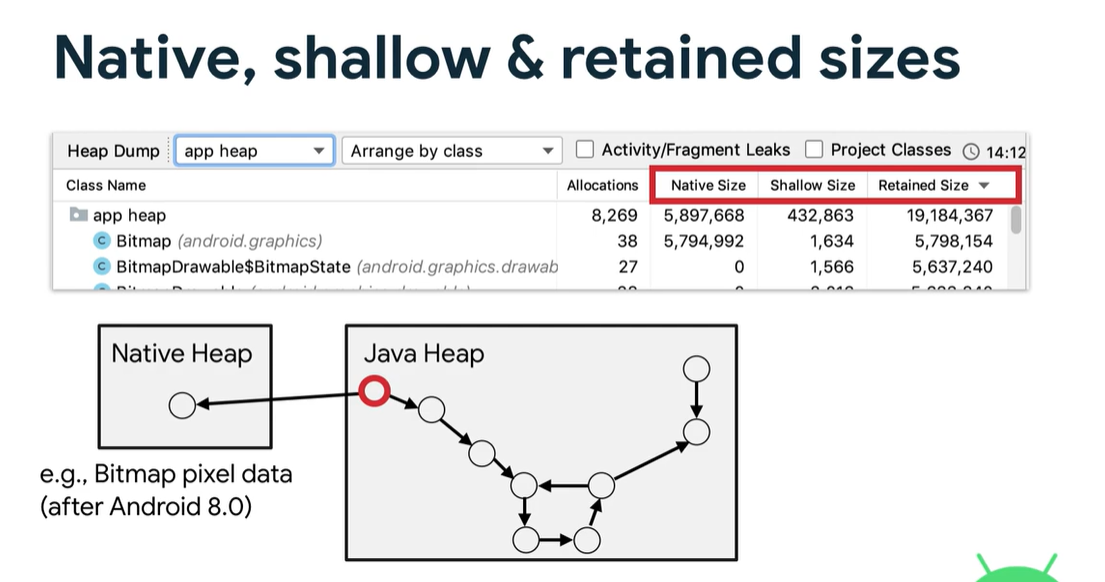 또 Bitmap 굉장히 많은 메모리를 사용합니다. Android 8.0 부터는 JVM에 메모리 사용에 대한 부담을 덜기 위해 Native Memory 를 사용한다고 합니다. 관련된 내용은 Demystify the data in Android Studio Profilers (Android Dev Summit '19) 영상의 4분 25초에 나옵니다.