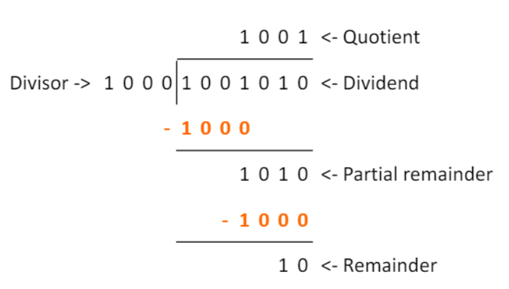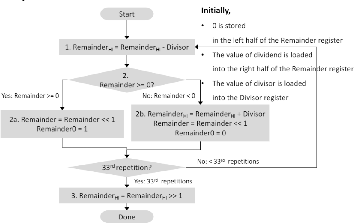 MIPS-기반으로 한 컴퓨터에서 32비트는 Dividend와 Divisor를 표현하는데 이용된다. 그러므로, Quotient와 Remainder <= 32 이다.