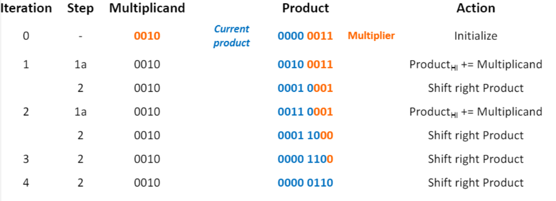 ex) N = 4일때(4-비트 ALU / multiplicand, 8-비트 product), 2 X 3 = ?