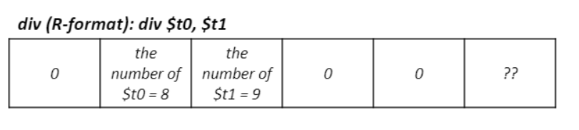 - 결과는 (remainder & quotient)는 HI와 LO에 저장되어 있다. (오버 플로우가 없거나 zero division 문제가 없을 시)