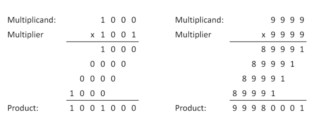 - 만일 multiplicand 와 multiplier가 m과 n 숫자를 가지고 있다면 product는 최대 m+n 숫자를 가지고 있다.