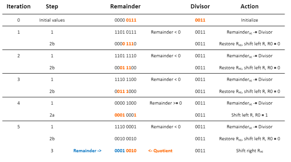- ex) N = 4(4비트 ALU / divisor, 8비트 remainder)에서 7/3 =?