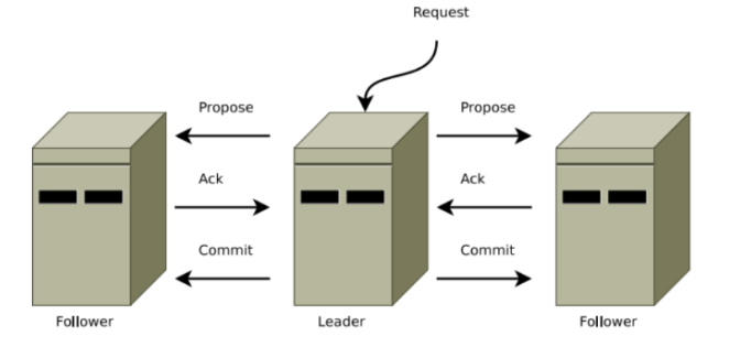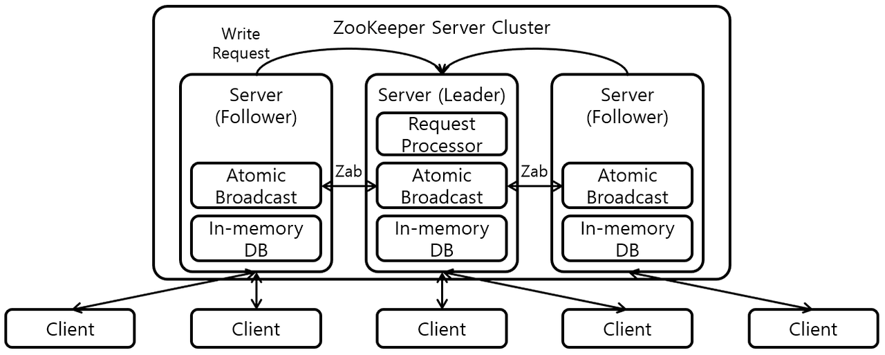 Zab (Zookeeper Atomic Broadcast Protocol) : Request Processor에서 처리한 요청을 트랜잭션을 생성하여 모든 서버에게 전파한다. [Leader-Propose] -> [Follower-Accept] -> [Leader-Commit] 단계로 구성