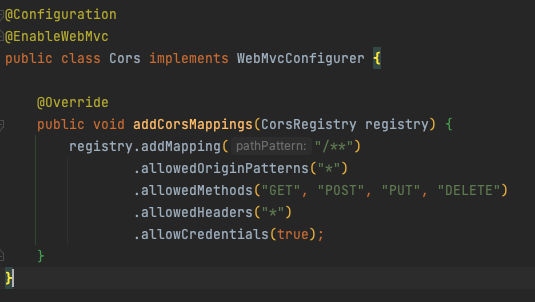 spring에서 cors를 처리해주었는데 이때 .addAllOrigin("*")으로 모든 경로를 열어주었다.