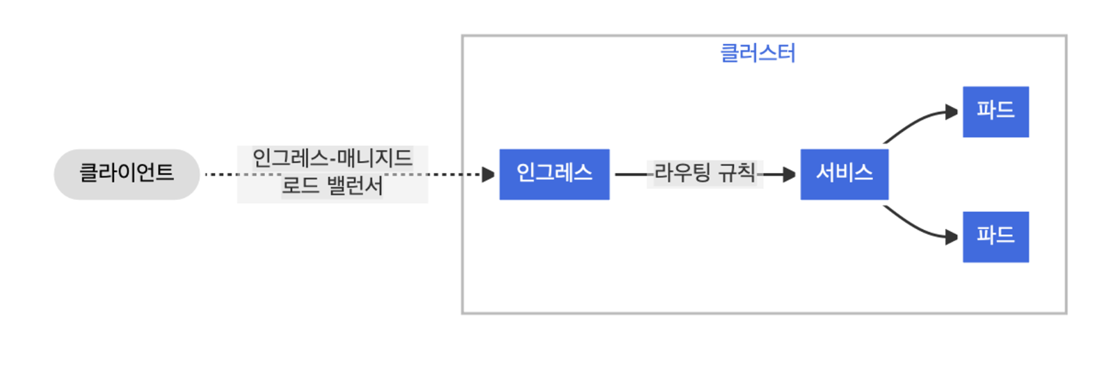 클러스터 외부에서 내부 서비스로 HTTP와 HTTPS 경로를 노출한다. 외부 트래픽이 파드에 전달되는 과정은 아래와 같다.