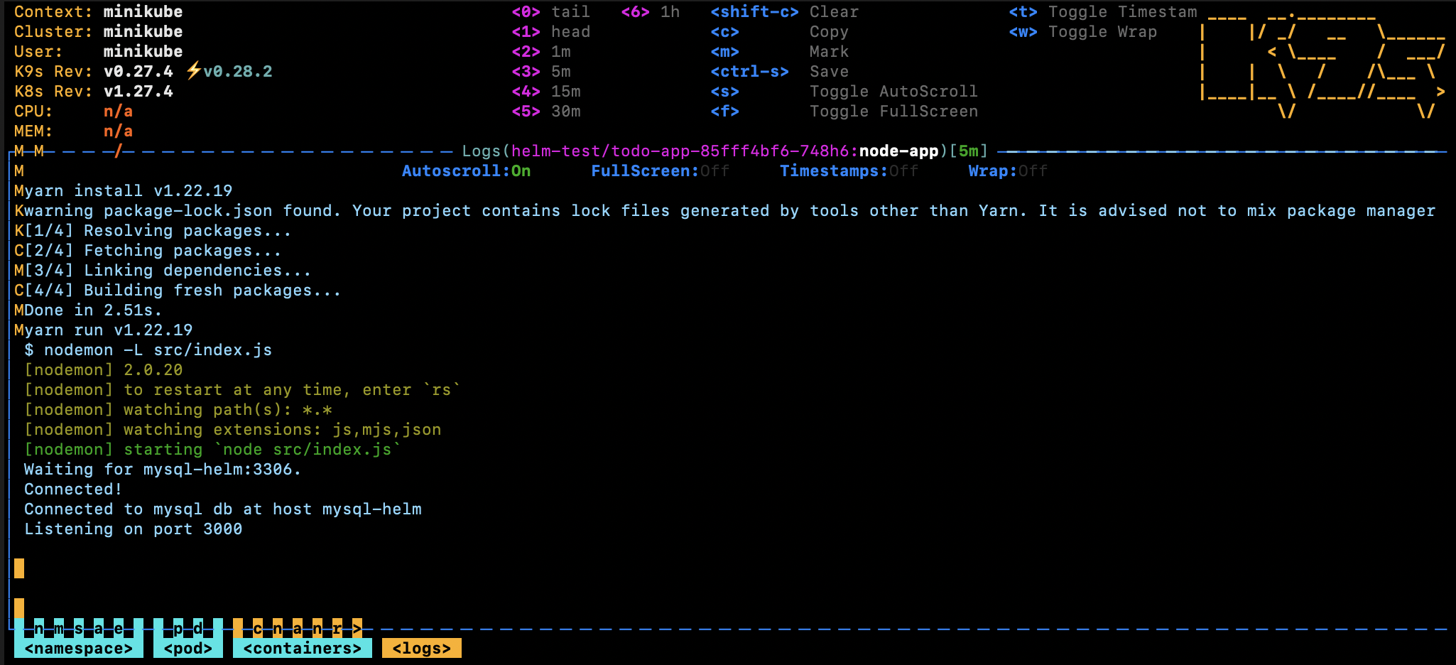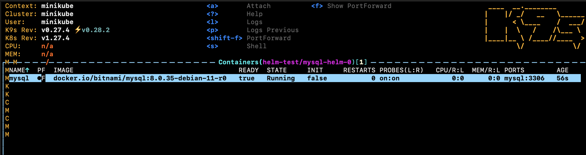 k9s를 이용해 배포된 파드 내 컨테이너 로그를 조회해본다. mysql-helm에 연결되었다는 것을 볼 수 있다!