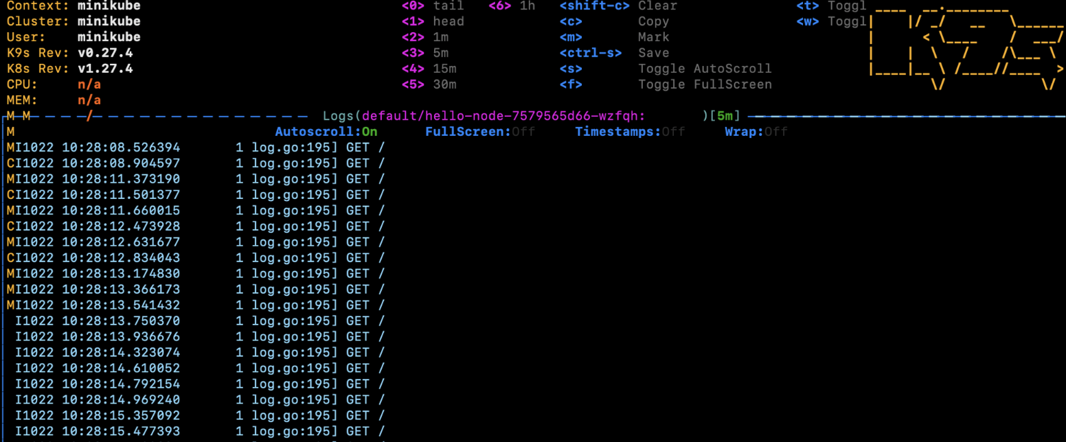 파드를 들어가면 로그를 볼 수 있다. 직접 터미널에 명령어를 치면서 일일이 입력하지 않아도 엔터몇번으로 이렇게 간단하게 개별 컨테니어의 로그를 볼 수 있다!!!