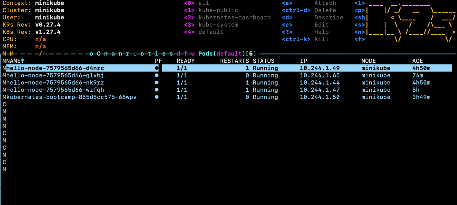 default라는 네임스페이스에 들어가보자. 이전에 minikube로 실습하면서 만들었던 파드목록들을 볼 수 있다.