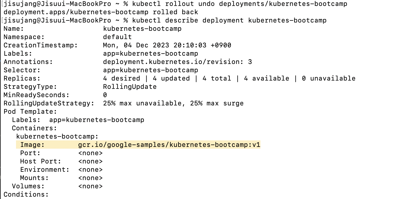 이전의 업데이트로 되돌리는 과정도 아주 간단하다. rollout을 사용한 명령어 1줄이면 끝!