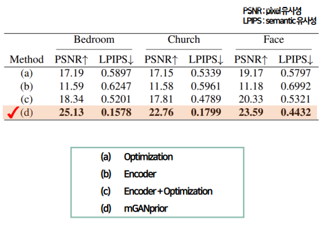 Super-Resolution을 목적으로 만들어진 모델 (b),(c)보다 특별한 목적이 없는 mGANprior 모델 (d)가 전체적으로 보았을 때 더 좋은 성능을 보이는 것을 확인할 수 있다.