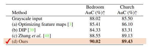 - Image Colorization을 목적으로 만들어진 (c)모델보다 특별한 목적이 없는 (d)mGANprior모델이 더 좋은 성능을 보이는 것을 확인할 수 있다.