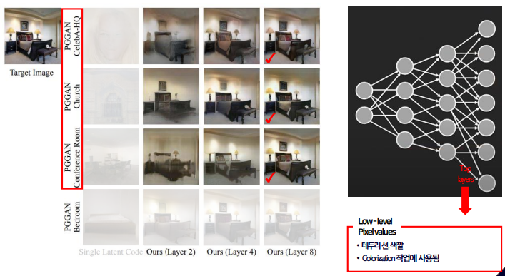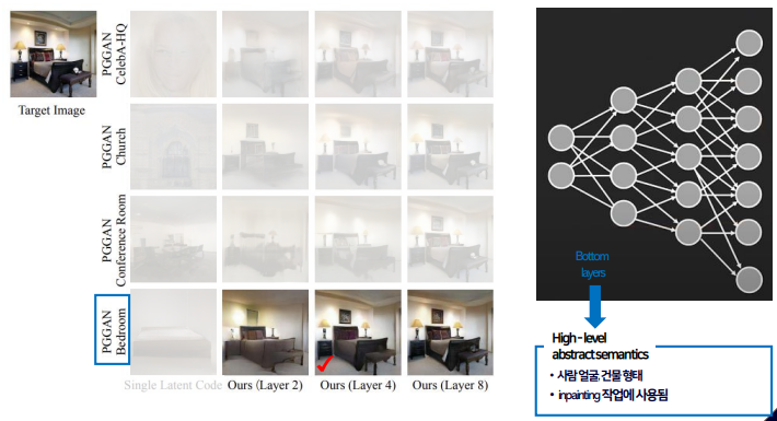 - 학습된 침실 semantic을 재사용해 타겟 이미지를 복구하는 것에 이용할 수 있어 4번째의 다소 낮은 layer만으로도 충분했기 때문이다.