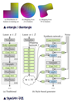 - latent vector Z를 Mapping network에 통과시킨 non-linear vector W를 이용하기 때문에 disentangle하게 되어 이미지 생성시 특징을 더 용이하게 조정할 수 있다.